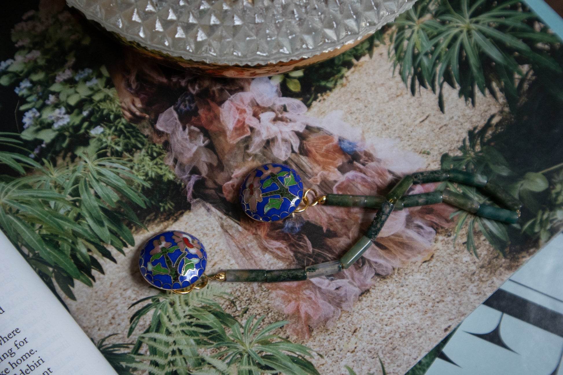 Handmade collar chain made with repurposed vintage cloisonné clip-ons linked by green aventurine beads threaded onto a delicate gold chain.