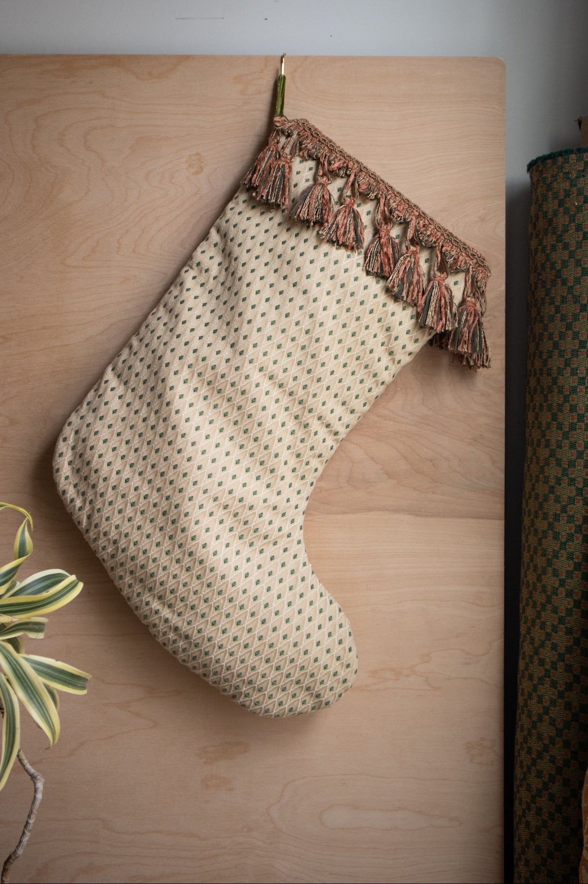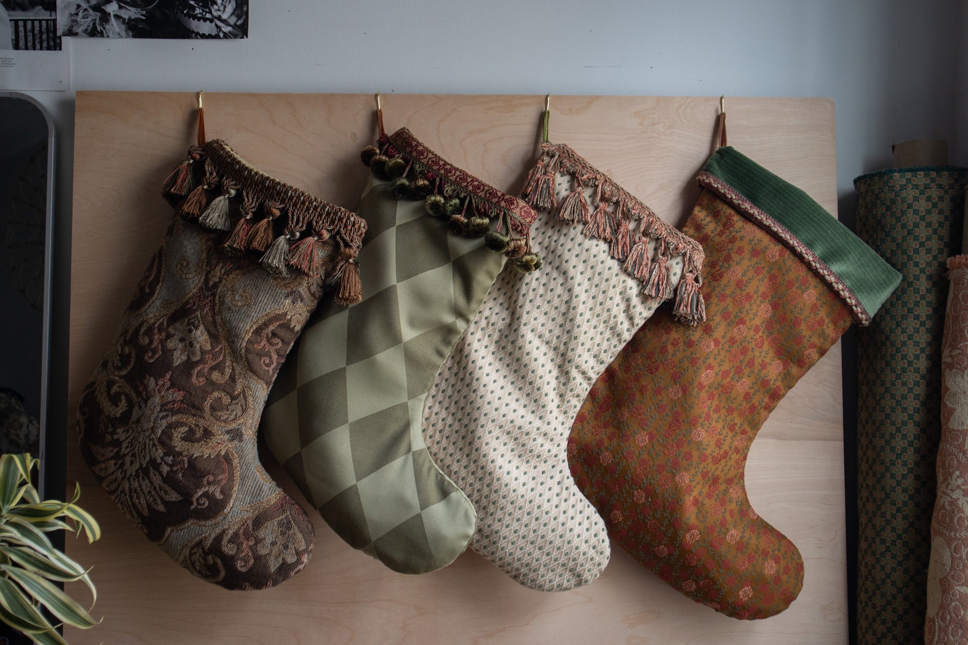 All stockings are handmade using a mix of carefully curated materials. Each one consists of a unique high quality inner lining, a seasonal hand sewn trim, and a signature by Honey charm. Your stocking purchase will also include a handmade by Honey dust bag to ensure its longevity.